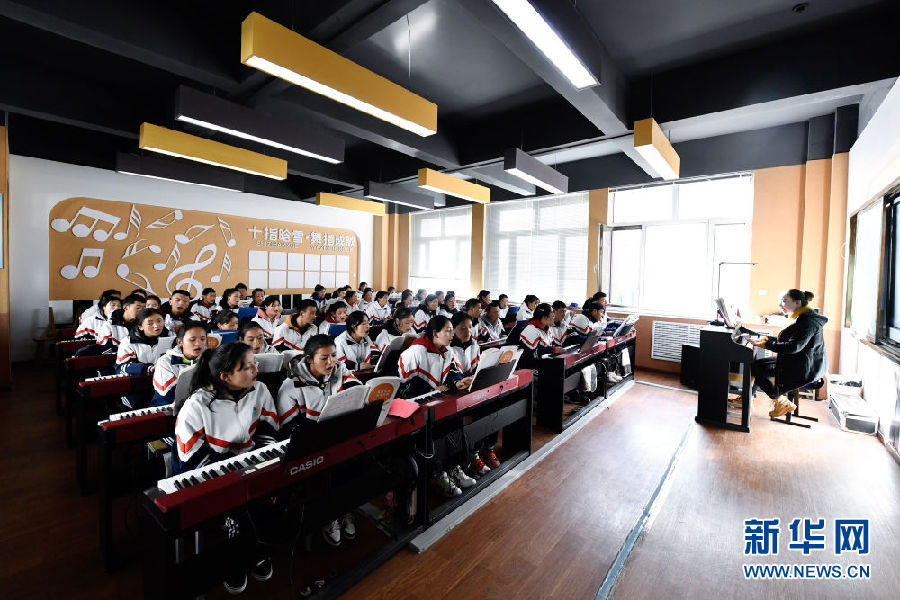 3月16日,在果洛藏族自治州職業技術學校,2020級學前教育專業學生在上音樂課。新華社記者 張龍 攝
