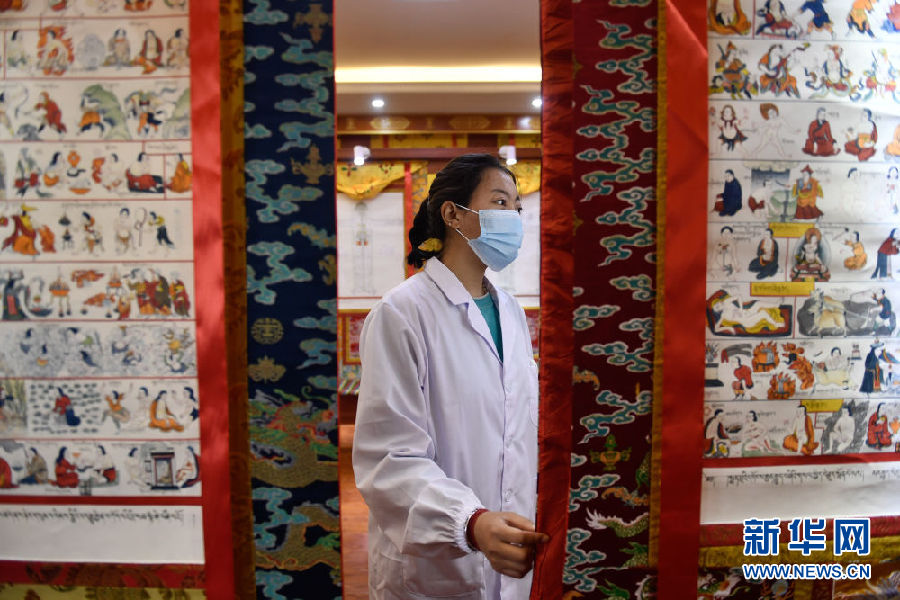 3月16日,在果洛藏族自治州職業技術學校,2020級藏醫醫療與藏藥專業學生才讓措通過藏醫典籍唐卡學習。新華社記者 張龍 攝