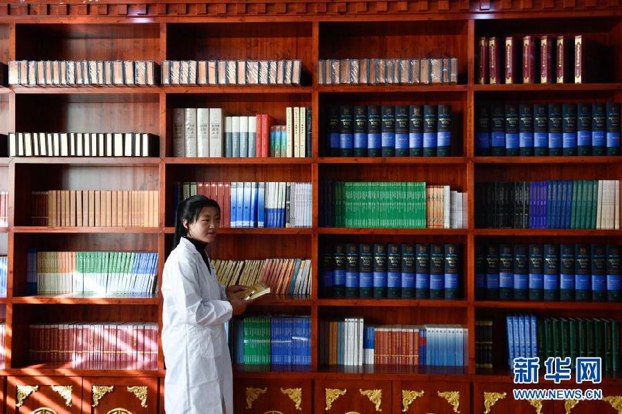 3月16日,在果洛藏族自治州職業技術學校,2020級藏醫醫療與藏藥專業學生德吉在借閱書籍。新華社記者 張龍 攝