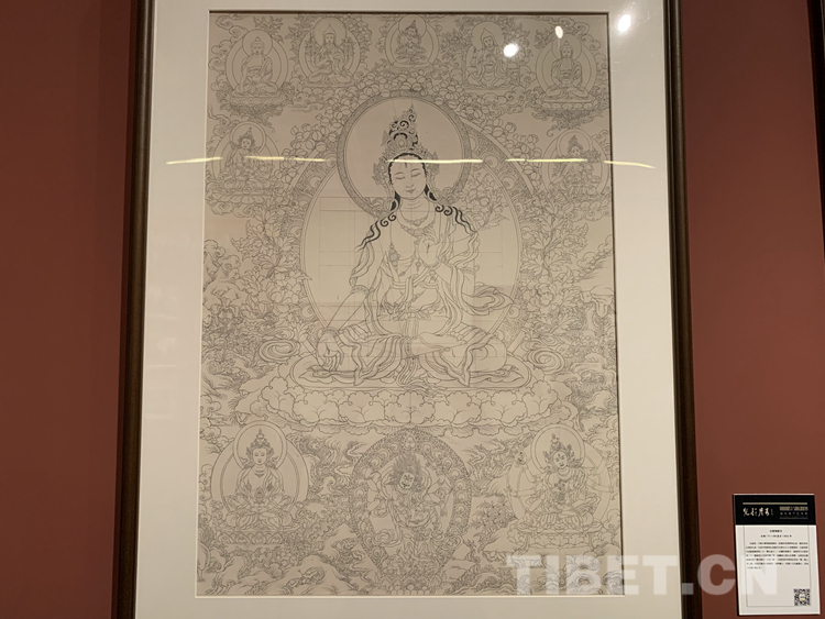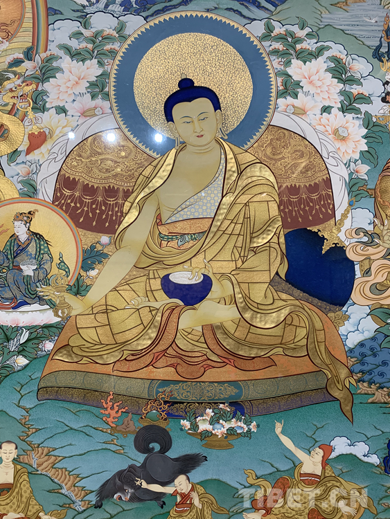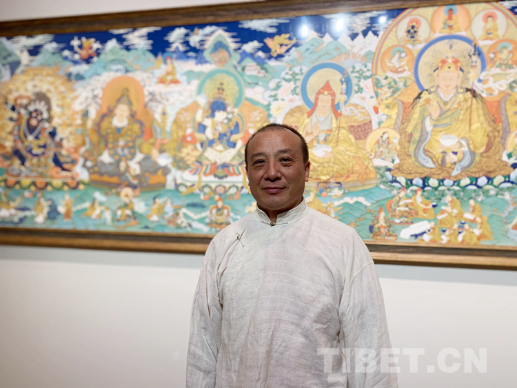 很多人對(duì)唐卡并不陌生,但對(duì)一幅唐卡是怎么被畫出來的卻是一知半解。唐卡的內(nèi)容大多來源于佛教里的經(jīng)文,里面有詳細(xì)的文字描寫,佛的穿著,顏色的搭配,甚至是佛們佩戴的首飾、拿的法器都有明確且詳細(xì)的記錄和與描寫。藝術(shù)家還需要有豐富的想象力和創(chuàng)造力,要有很強(qiáng)的構(gòu)圖能力,最重要的是要遵照《度量經(jīng)》等佛教儀軌,正規(guī)的去畫。“創(chuàng)作一幅唐卡不容易,藝術(shù)家必須要懂佛教的文化、儀軌,懂《度量經(jīng)》,再加上藝術(shù)家自己的藝術(shù)創(chuàng)造能力,才能夠畫好一幅唐卡,這需要藝術(shù)家的綜合能力。”娘本繼續(xù)說:“起稿、涂色、暈染、拉金線、拉線條等每一步驟都是在考核藝術(shù)家自身的能力,藝術(shù)家自己要不斷地學(xué)習(xí):學(xué)習(xí)佛教文化,了解文化的內(nèi)涵,藝術(shù)家需要更多地把心思投入到唐卡,并提高自身的藝術(shù)造詣才能夠畫好一幅唐卡。”