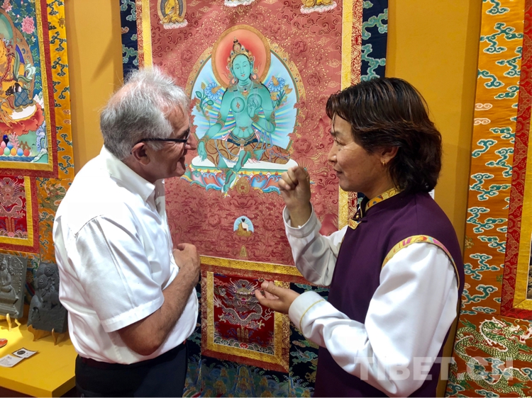 圖為熱貢藝術傳承人格桑嘉措為外國游客講解熱貢文化 攝影:尼知加