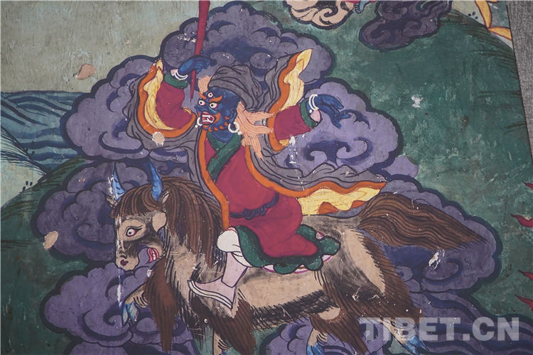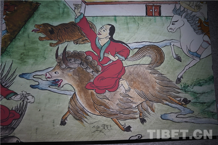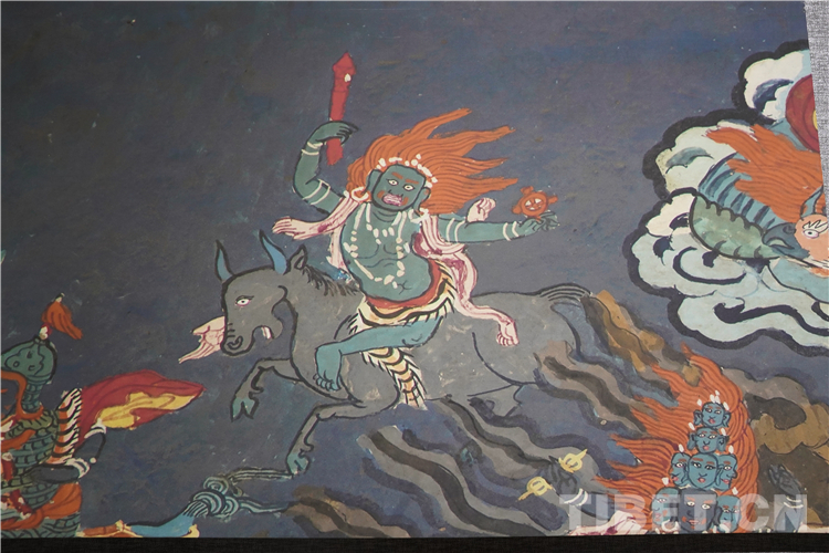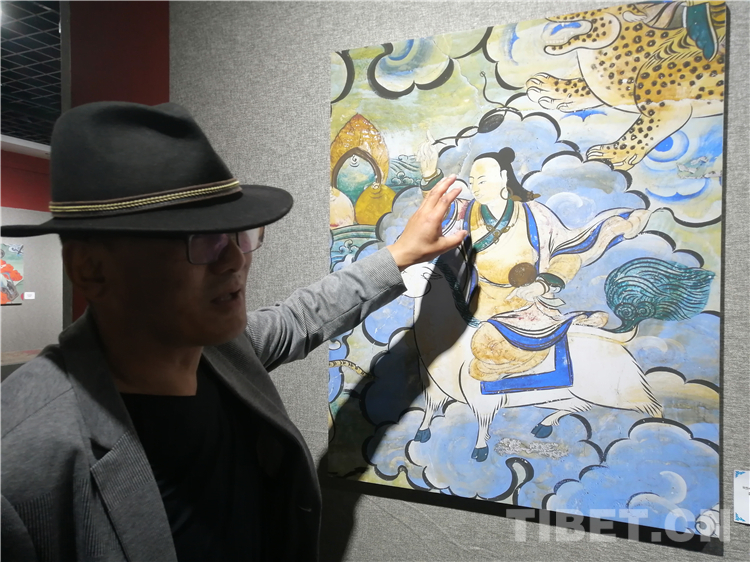 展廳中還有一副遠看非常另類,細細欣賞漢藏繪畫風格交流交融的作品,那是一幅四川省阿壩藏族羌族自治州金川縣墨爾多神山壁畫的局部作品。東智先生說:“這幅局部畫作從發髻、服飾等多個方面充滿了漢族風格,甚至人物穿的還是漢服,座下是像馬一樣的牦牛,但是手上掄著古朵(古朵指的是用牦牛毛或者山羊毛編織成的拋石繩,可以將石頭投擲到較遠的地方,是牧民們用來放牧的工具),非常有辨識度,充滿藏族文化特色。”