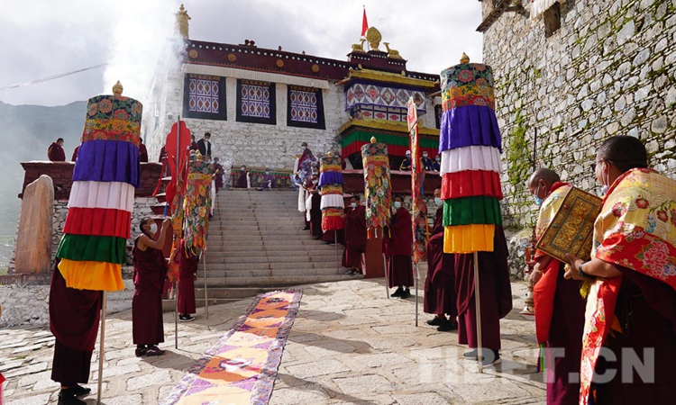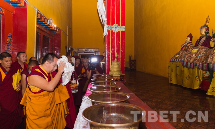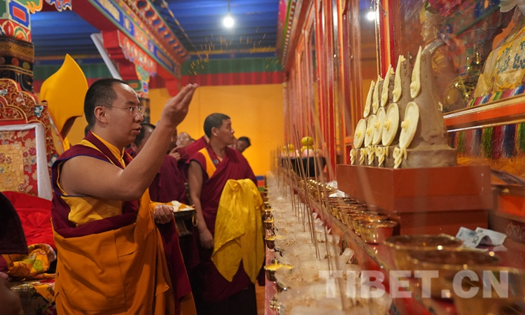 在乳巴寺,十一世班禪先后朝拜了甘珠爾拉康、文物珍寶殿、護法神殿等,隨后在杜康殿為僧眾摸頂傳授《兜率天上師瑜伽修法》。(中國西藏網 記者/王淑 趙耀 鄭朔)