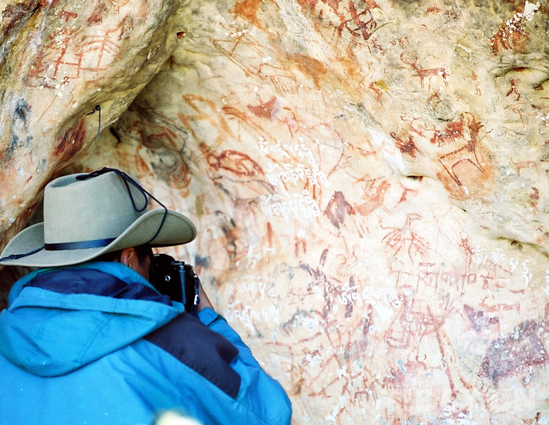 這是藏北高原無人區科考人員在考察溶洞巖畫(唐召明2001年攝)