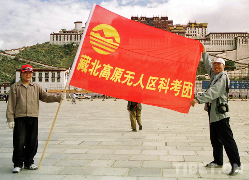 這是唐召明在隨藏北高原無人區科考團出征時,展隊旗拍照留念(唐召明提供,2001年攝)