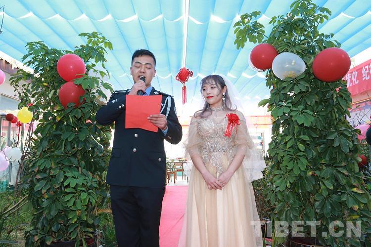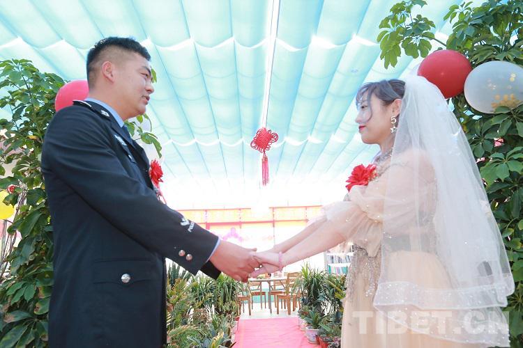 “今天能在警營里完成婚禮,非常的激動。結婚是女人一生中最幸福的時刻,非常感謝單位的領導能給我們這樣的機會,讓我倆一起度過人生中最幸福的時刻。這次的婚禮非常的有意義,將是我們一生中最寶貴的回憶,警營讓我成為最美麗的新娘。”新娘王從琬含著淚激動地說。(中國西藏網 通訊員/張拴根 記者/王佳豪)