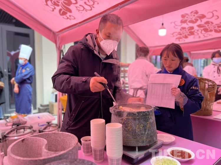 圖為林芝市職業(yè)技術(shù)學校師生在展示區(qū)烹飪石鍋藏香雞 攝影:德吉卓瑪