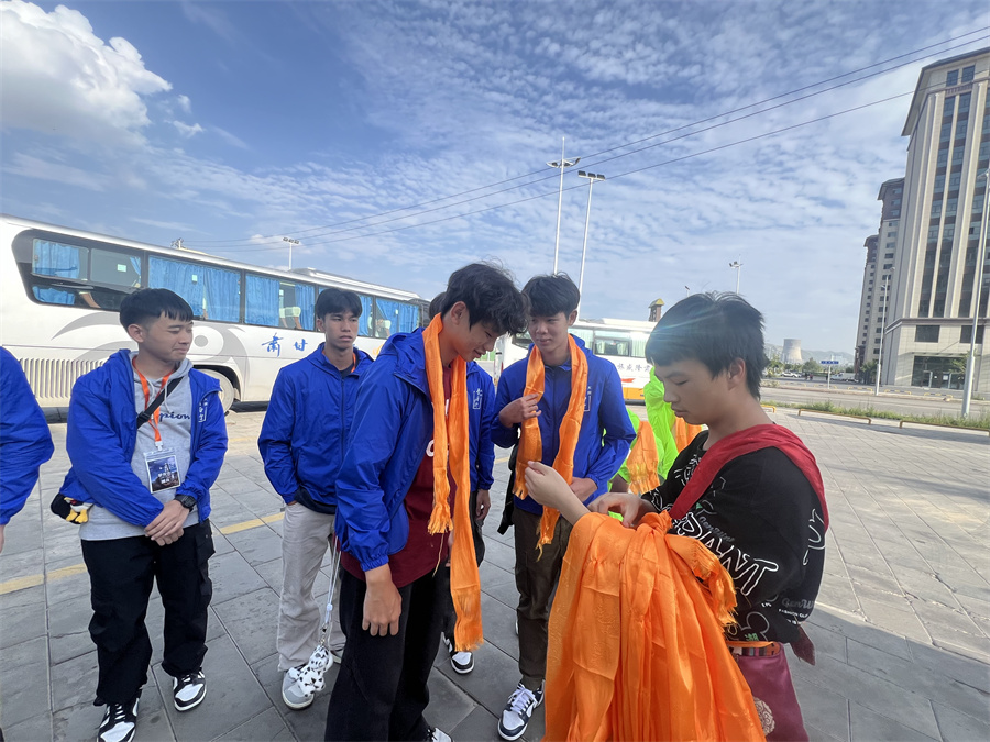圖為青海當(dāng)?shù)孛癖娤蛳愀埕缅\秋中學(xué)(屯門)學(xué)生獻(xiàn)哈達(dá)。攝影:李思琦老師