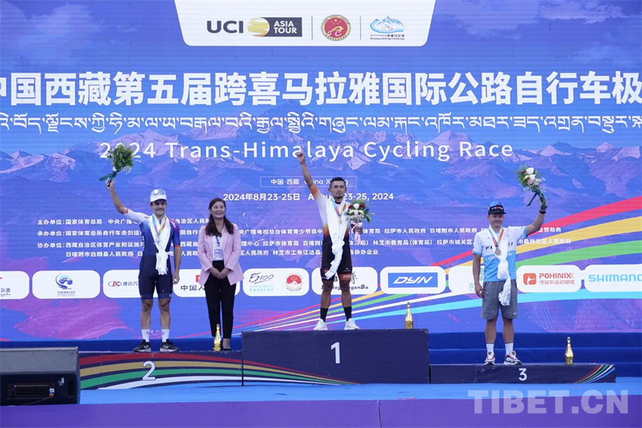 圖為日喀則賽段前三名,同時該段第一名CHIA BERMUDEZ Luis Carlos摘下個人沖刺總積分的桂冠 攝影:邊子捷