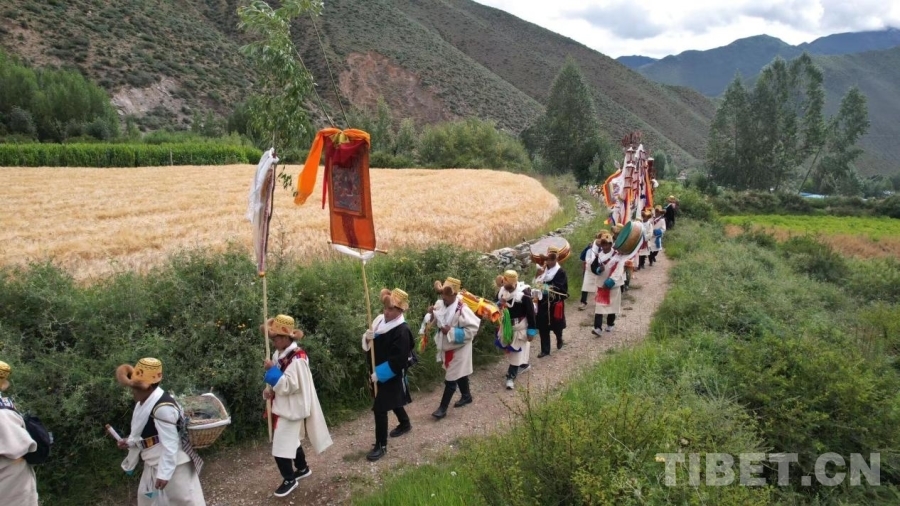 當(dāng)天清晨,村民們一大早身穿華麗的藏裝,頭戴“次仁金果”、高舉幡旗、身背經(jīng)書(shū)、手持青稞麥穗等作物,分成兩隊(duì)從村口出發(fā),轉(zhuǎn)村里的每一塊農(nóng)田進(jìn)行“收斂地氣、祈求豐收”的巡游活動(dòng)。浩浩蕩蕩的隊(duì)伍傾村而出,大家以不同的口號(hào)與詠唱,祈求風(fēng)調(diào)雨順,國(guó)泰民安。
