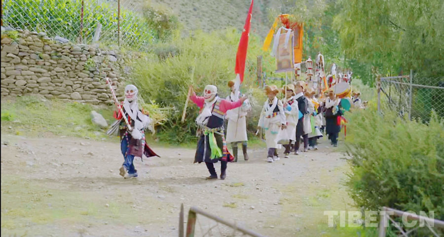 在望果節(jié)這一天,村里會(huì)選四位村民扮演成“土鍋杰日”,他們戴著面具,身穿“土鍋杰日”獨(dú)有的服飾走進(jìn)每家每戶表演“羌姆”舞祈求平安順?biāo)?、?lái)年豐收。這個(gè)特別的儀式蘊(yùn)含著勞動(dòng)人民勤勞智慧、團(tuán)結(jié)互助、尊重自然的價(jià)值理念。