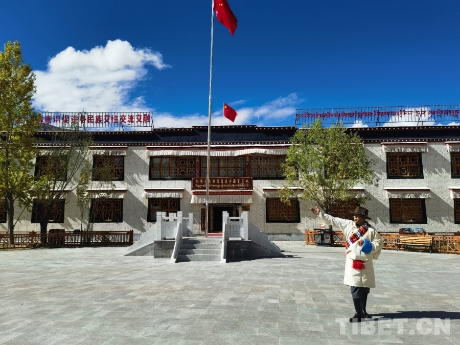 圖為拉巴次仁介紹位于普納村的仁布縣民族團結進步教育基地 攝影:蔣馨悅
