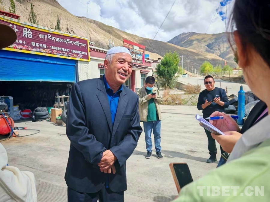 圖為馬彬林在汽修店前接受采訪 攝影:西藏自治區網信辦格桑