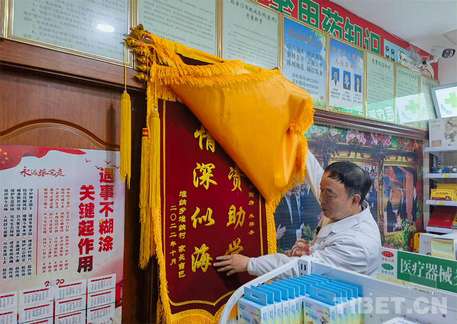 不僅如此,朱祥務(wù)還經(jīng)常主動(dòng)為病人減免藥費(fèi)。在藥房收銀臺(tái)后的墻上,掛著一塊顯眼的“雙擁門(mén)店”的標(biāo)牌,上寫(xiě)“退役軍人、現(xiàn)役軍人、消防指戰(zhàn)員全場(chǎng)9折”,一個(gè)月下來(lái),藥房光折扣掉的費(fèi)用就高達(dá)十多萬(wàn)。對(duì)于五保戶、殘疾人員、當(dāng)?shù)氐睦щy群眾和外地務(wù)工的民工,朱醫(yī)生大藥房提供免費(fèi)看診。在采訪期間,就有一位來(lái)自搬遷村的居民走進(jìn)藥房,默默地取走了需要的藥品。“對(duì)我來(lái)說(shuō),開(kāi)藥房、診所不是為了掙錢(qián),是因?yàn)楫?dāng)?shù)厝诵枰摇!?/p>