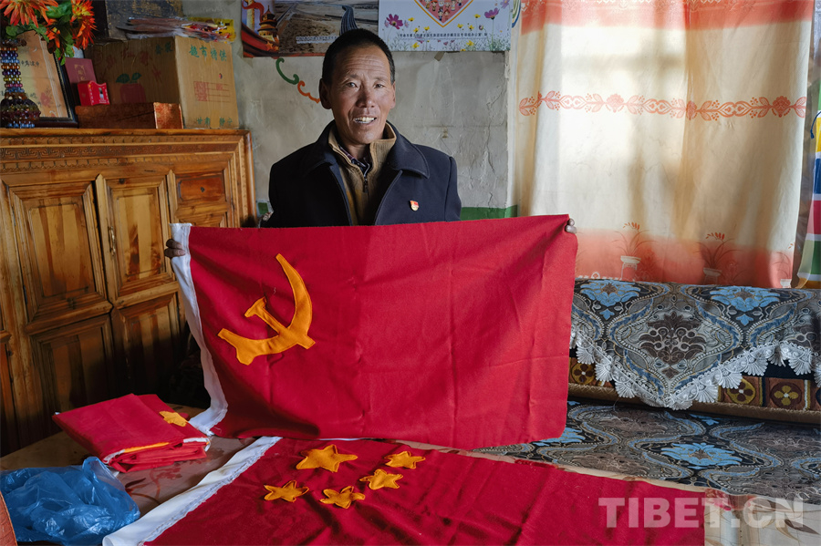 多吉才覺對黨和國家的愛也體現在一處平時的小愛好中。2018年起,多吉才覺開始嘗試親手縫制黨旗和國旗。雖然鐮刀和斧頭形狀不算完全標準,國旗上的小星星也略顯圓稚可愛,但是,一針一線都凝結著多吉才覺真摯的敬愛。他說:“成為黨員后,我總是想著還要給黨、給國家做點什么事情。”從他清澈的眼神中,我們知道這話中的真情絕不作偽。幾年下來,多吉才覺閑暇時縫制的紅旗也裝滿了一大袋。