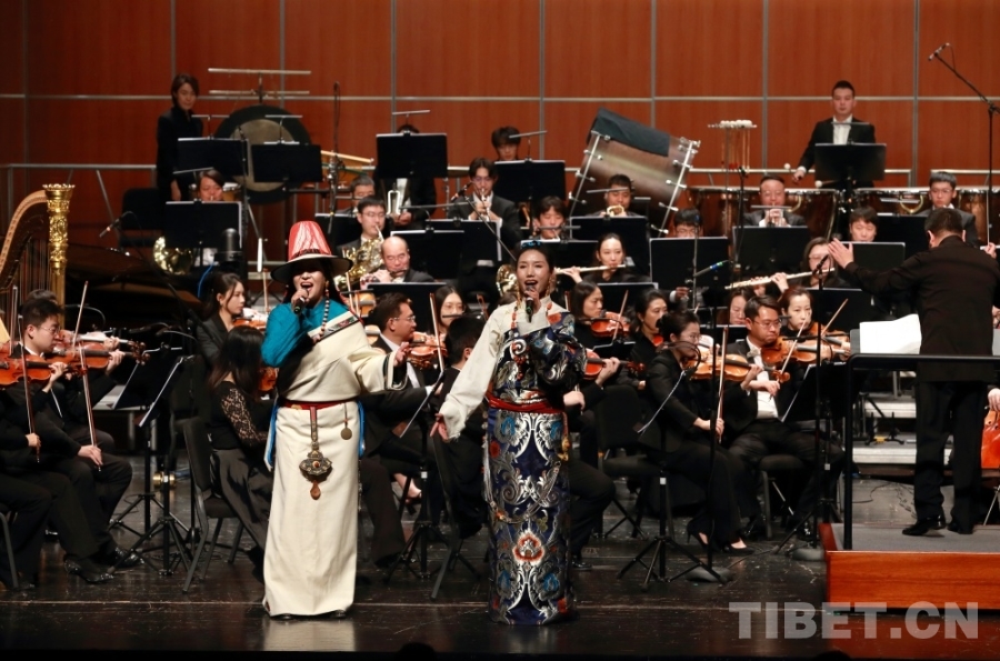 音樂(lè)會(huì)上,兩位藏族歌手演唱了交響樂(lè)主題曲《金橋》,歌曲高亢嘹亮、曲調(diào)悠揚(yáng)。藏戲、山歌等元素的加入,讓交響樂(lè)更加豐富,充滿了濃郁的民族風(fēng)情。