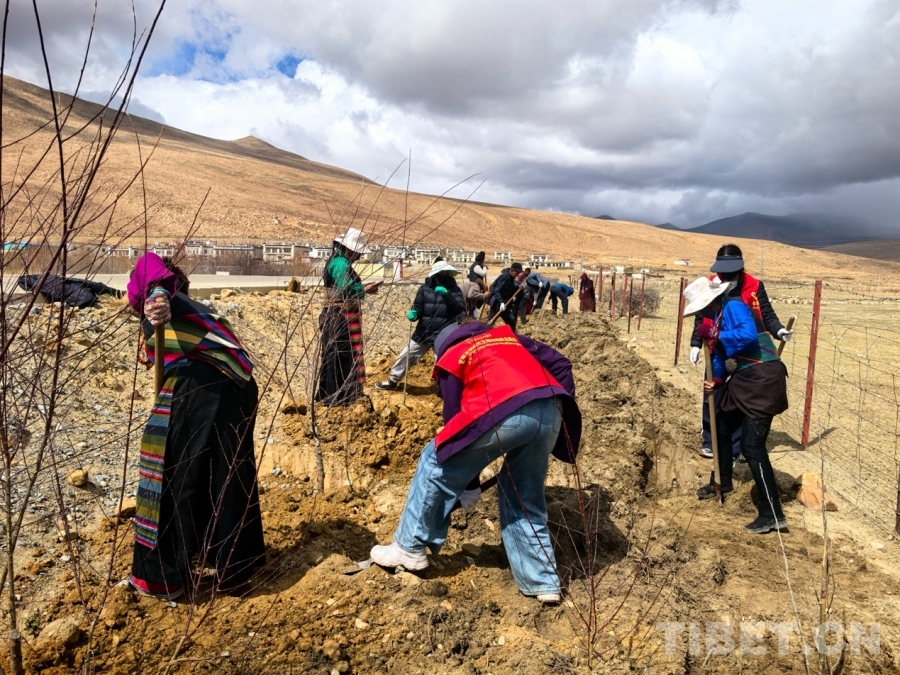 伴隨著一次次鐵鍬鑿擊地表的“嚓嚓”聲、此起彼伏的藏語勞動歌曲和樹苗抖動的“沙沙”聲,一排排規整的樹坑網格慢慢被鑿出,一棵棵象征希望的樹苗緩緩落下,一抔抔承載著綠色生命的黃土再次埋下,村主干道邊綿延80余米的“綠色生命線”初見雛形,120余棵樹苗挺立村道兩側,以“綠絲帶”串聯村莊,為春日家園增添盎然生機。