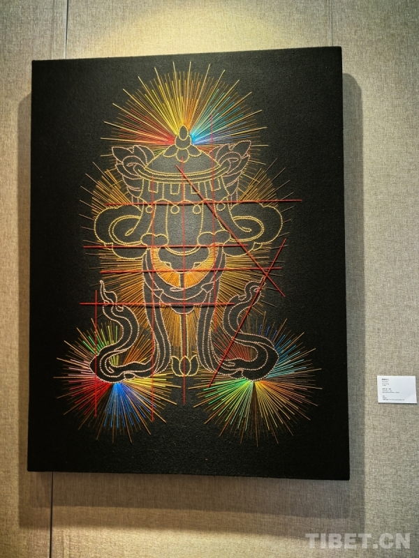 索喃次仁的作品慣以手工羊絨布為面,彩色羊毛線為語言,呈現(xiàn)標(biāo)志性的“彩虹”元素?!埃ㄎ鞑兀﹤鹘y(tǒng)的藝術(shù)是有一定標(biāo)準(zhǔn)的,而當(dāng)代藝術(shù)是可以無界的,包括材質(zhì)、材料都可以有所創(chuàng)新,是表達(dá)個(gè)人情感和生活的一種藝術(shù)形式。我常常問自己,能不能突破傳統(tǒng)?可不可以做一些比較新的東西?像我現(xiàn)在創(chuàng)作選擇用羊絨布,就是我的一種情感表達(dá),因?yàn)椋ㄋ┡c我的家鄉(xiāng)有深切關(guān)系?!彼鬣稳式忉尩?/span>:“比如說這一幅作品,佛像外呈現(xiàn)出一種彩虹的狀態(tài)。因?yàn)椴屎绫旧硎且粋€(gè)無常的現(xiàn)象,而我之前學(xué)過唐卡佛像,所以把佛像和彩虹理念結(jié)合了,這既是一種傳承,也是突破?!?/span>