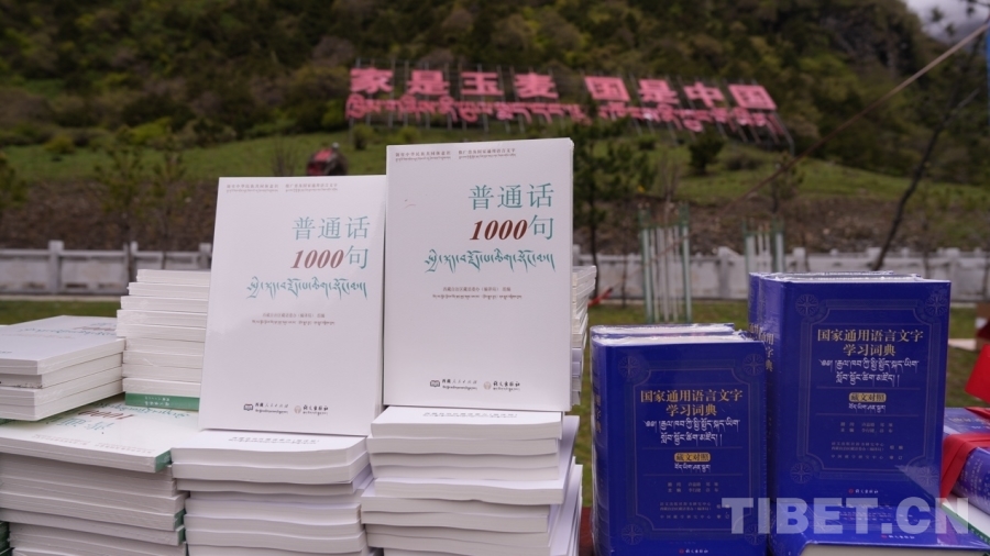圖為《普通話1000句》漢藏對(duì)照版、《國家通用語言文字學(xué)習(xí)詞典》(藏文對(duì)照)等書籍