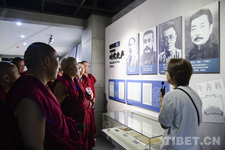 圖為在嘉興五四文化博物館內(nèi)西藏佛學(xué)院師生認(rèn)真聆聽關(guān)于五四運(yùn)動的講解 攝影:趙振宇