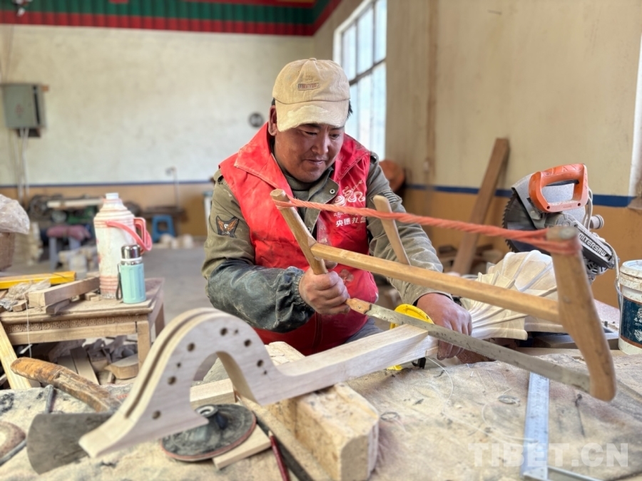 作為“堆諧之鄉”拉孜縣的代表性樂器,扎念琴制作已有數百年歷史。合作社負責人頓加介紹,一把純手工扎念琴需選用楊木做共鳴箱、花梨木制琴桿,經過刨削、雕鏤、蒙皮等20余道工序,一個人耗時6天左右方能完成。“琴頭雕馬象征吉祥,背面‘巴絡'凸紋既美觀又防滑,這些都是祖輩傳下的智慧。”如今,這項非遺技藝通過“致富帶頭人+合作社+農戶”模式,年生產扎念琴超500把,帶動社員人均年收入達4.5萬元。