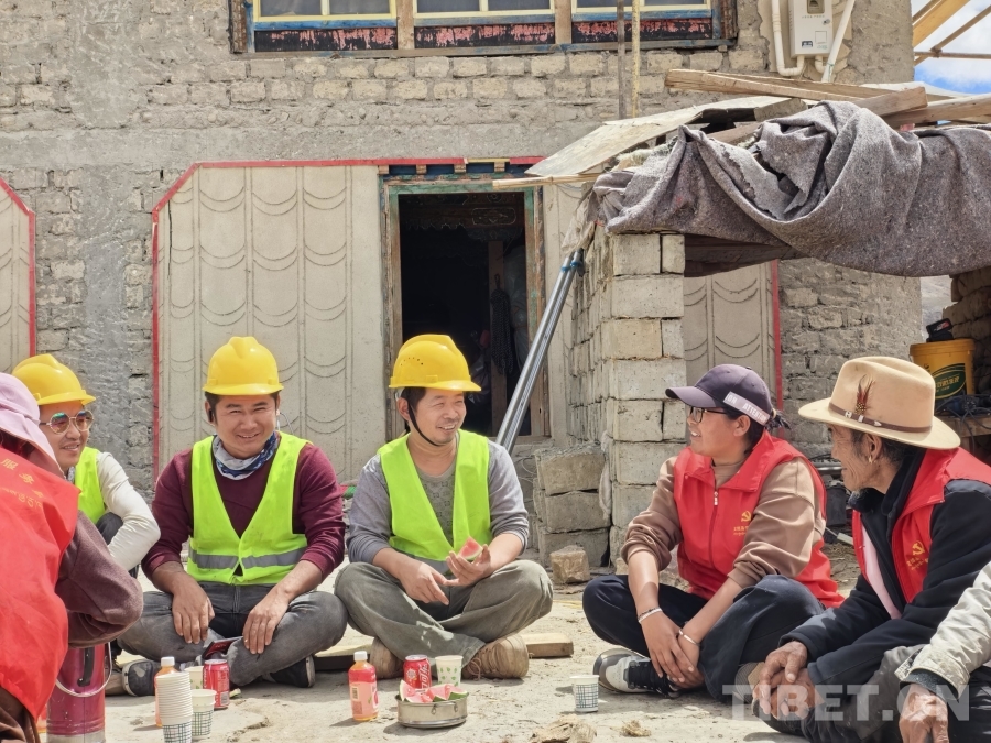 負責白瑪村重建的四標段施工隊,隊員來自五湖四海。來自山西五臺山的建筑工人張計平喝完酥油茶感慨道:“這茶咸中帶甜,干完活喝下去特別解乏提勁!老鄉們太熱情淳樸了,讓我們干活都更有勁兒!”一旁的安全員陳灝吃著西瓜補充道:“我們一定爭取早日讓鄉親們住進安全舒適的新家!”