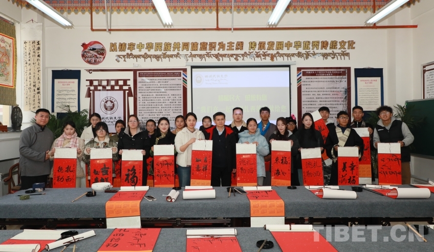 走進西藏民族大學社科樓里內的“鑄牢中華民族共同體意識書法實踐基地”,基地負責人扎西曲杰正帶領他的小伙伴書寫書法作品。指著一幅幅書法作品,扎西曲杰自豪地說,我們基地的各族學生用“寫”在一起的形式傳承中華優秀傳統文化,推廣國家通用語言文字,助力中華民族共同體建設。