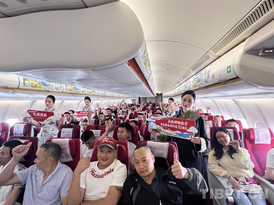 在8L9669航班上,身著藏裝的乘務員們,在迎客環節便為每一位旅客獻上潔白的哈達,讓旅客們一登機便感受到濃郁的藏族風情與滿滿的祝福。平飛階段,乘務員組織旅客開展了一系列趣味活動。在有獎競答環節,旅客們爭相作答關于西藏文化和祥鵬航空進出藏航線的問題;“進藏故事”分享會引發情感共鳴,旅客們或追憶援藏歲月,或暢談高原情懷,真摯講述贏得陣陣掌聲。
