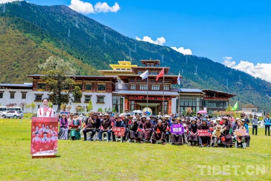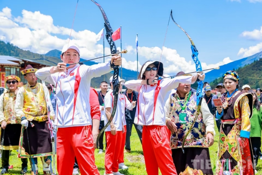 圖為奧運冠軍同當地村民一同體驗西藏傳統體育項目工布響箭