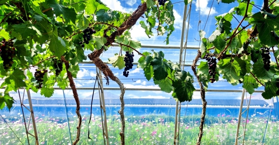 圖為才納園區溫室里正在成熟的葡萄。室外大片花朵開遍草地 攝影:劉莉
