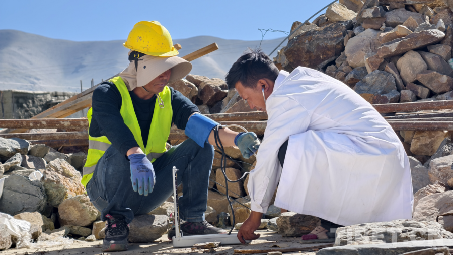 健康守護網,筑牢重建防線。月初頂層澆筑時,施工隊員老張不慎踩中鐵釘。駐村工作隊立刻協同村醫貢嘎旦增現場處置,全程跟蹤治療確保傷口未感染。貢嘎旦增的足跡遍布工地,開展健康服務5輪,測量血壓47人次,發放常用藥品30余份,覆蓋200余人。鄉衛生院院長為19名群眾定制慢性病方案,藏醫拉姆的“呼吸調節法”更有效舒緩了70余人的心理焦慮。