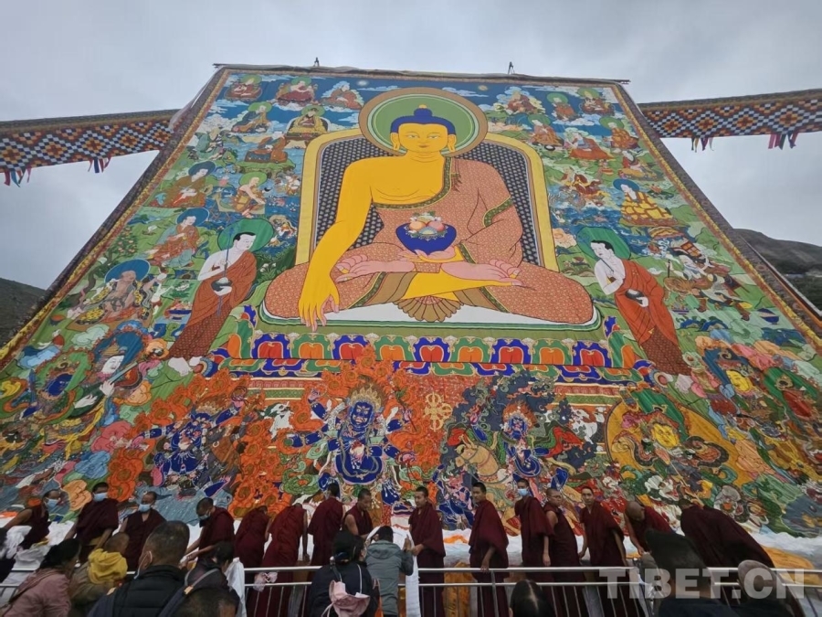 中國西藏網訊 8月23日晨,西藏自治區拉薩市色拉寺舉行展佛活動,展出巨幅釋迦牟尼佛唐卡,標志著一年一度的拉薩雪頓節拉開了序幕。