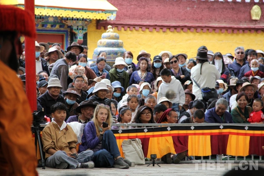 城市另一處地標羅布林卡同樣人群涌動,摩肩接踵。這里,愛戲的觀眾早早在舞臺前擺上了板凳,甚至帶來了牦牛肉、甜茶,準備享受一個愜意的假日。雪民間藏戲隊演出《朗薩雯蚌》,戲劇沖突曲折跌宕,人物演繹生動鮮活,不時引起觀眾陣陣大笑或掌聲。