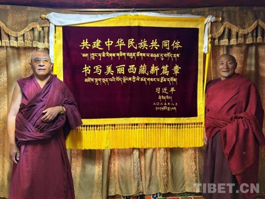 中央代表團向孝登寺贈送了習近平總書記題詞的“共建中華民族共同體 書寫美麗西藏新篇章”賀幛。土登對此深有感觸:“‘共建中華民族共同體’意味著56個民族共同致力于中華民族的偉大夢想;‘書寫美麗西藏新篇章’是指西藏從1965至今發生巨變,我們正在此基礎上創造更美好的未來。”