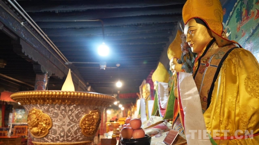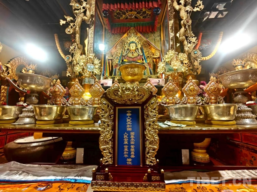 圖為孝登寺主供佛——釋迦牟尼佛像,以及前方擺放的該寺為慶祝西藏自治區成立60周年而特別制作的祿位