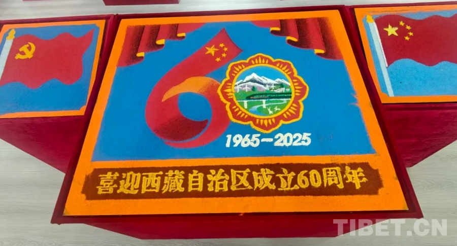圖為孝登寺鑄牢中華民族共同體意識展覽館內,該寺僧人特別為西藏自治區成立60周年精心自制的沙畫