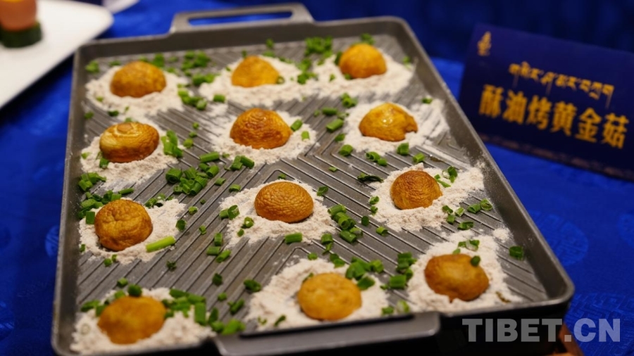 圖為廚房內展示的“酥油烤黃金菇”菜品