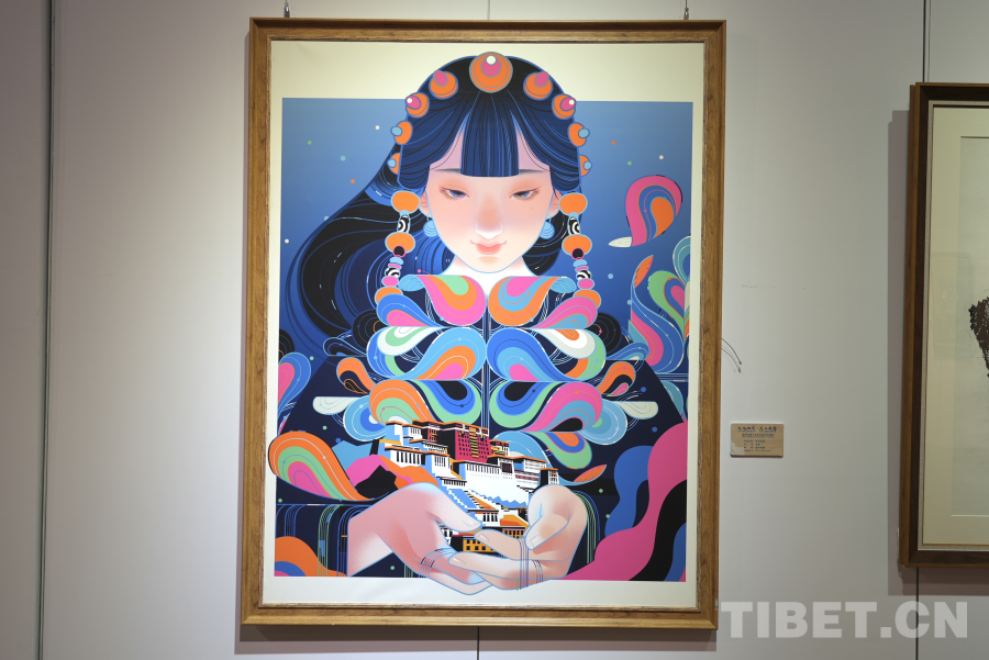 展覽現場,參展藝術家李旻的作品《虹光圣城》色彩絢麗,構思新穎,引得眾多觀眾駐足觀看。據介紹,本幅作品是一副綜合運用了現代藝術創作手段的數字繪畫,同時融入了如布達拉宮、藏裝等經典的藏式元素,畫面生動,色彩鮮艷,形式新穎,展現了當代西藏藝術的傳承與創新,是本次展覽極具代表性的作品之一。
