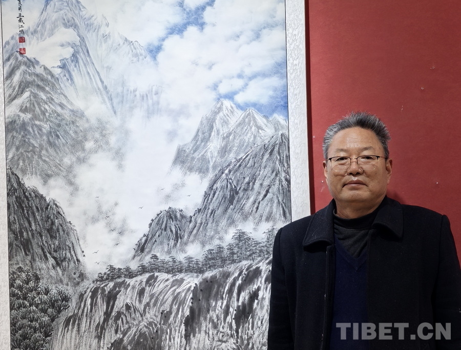 圖為王藏江與他的國畫作品《珠穆朗瑪》