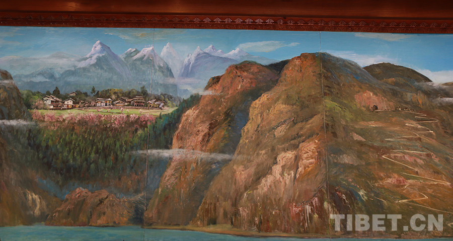 圖為色龍村內建筑上的壁畫,生動描繪了色龍村所處的特殊地理條件,右邊的盤山公路蜿蜒通過隧道之后而有左邊的“桃花源” 攝影:王妍丹