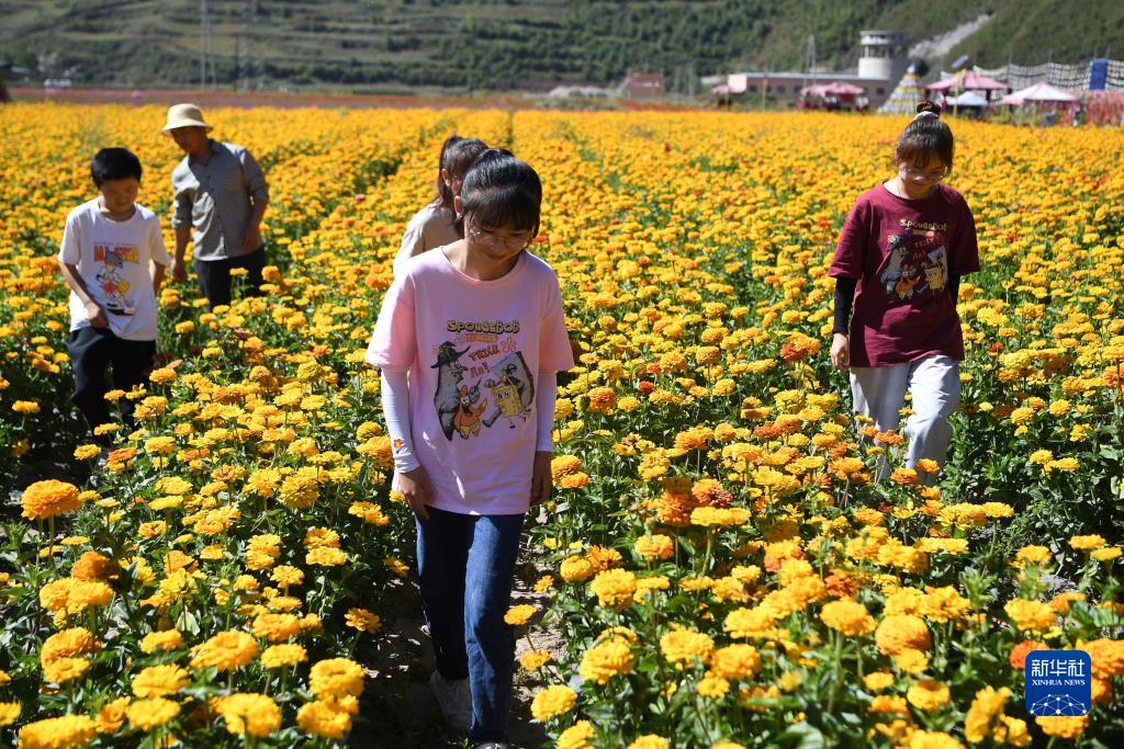 幾名游客在甘肅甘南卓尼縣木耳鎮力賽村的花海游覽(9月11日攝)。新華社記者 陳斌 攝