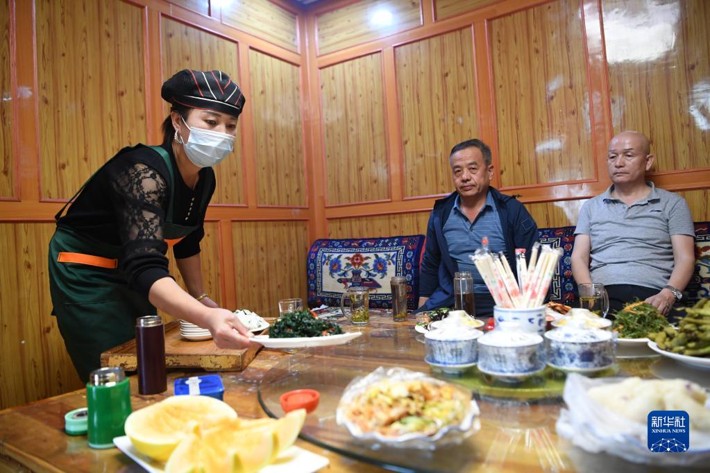 甘肅甘南卓尼縣木耳鎮力賽村村民李日占草(左)在自家的農家樂里為客人上菜(9月11日攝)。新華社記者 陳斌 攝