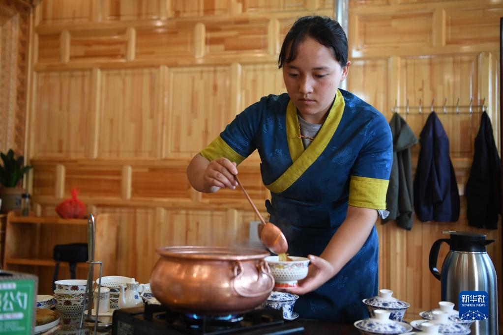 甘肅甘南卓尼縣木耳鎮力賽村村民拉姆卓瑪在自家的農家樂里為客人盛湯(9月11日攝)。新華社記者 陳斌 攝