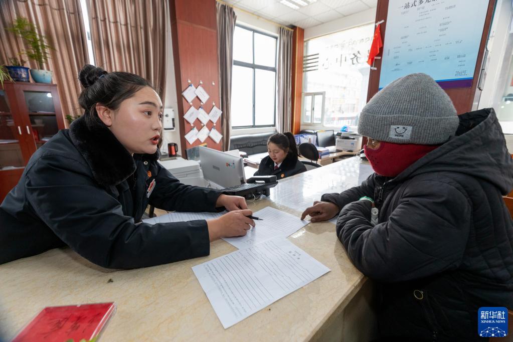在石渠縣人民法院,“正義雪蓮”女子審判團隊成員(左)為當地居民提供法律咨詢(1月11日攝)。新華社記者 沈伯韓 攝