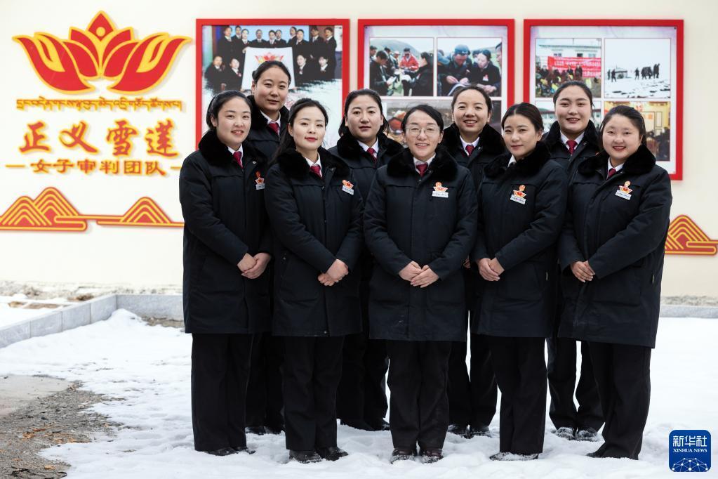 石渠縣人民法院“正義雪蓮”女子審判團隊部分成員合影(1月11日攝)。新華社記者 沈伯韓 攝