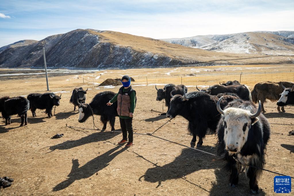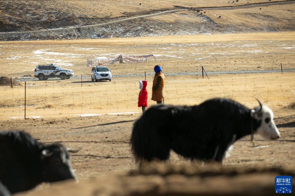 “正義雪蓮”女子審判團隊成員乘車來到距離石渠縣城70公里的呷依鄉(xiāng),準備通過巡回審判開庭審理一起離婚案。當事人之一站在牦牛群中,等待法官清點牦牛數量,為其進行財產分割(1月10日攝)。新華社記者 沈伯韓 攝