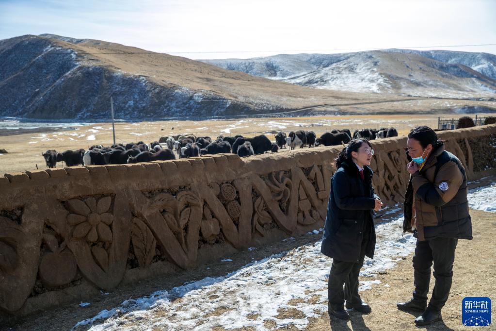 “正義雪蓮”女子審判團隊成員乘車來到距離石渠縣城70公里的呷依鄉(xiāng),準備通過巡回審判開庭審理一起離婚案。在當事人家的院子里,法官澤仁曲西(左)與當事人之一進行交流(1月10日攝)。新華社記者 沈伯韓 攝
