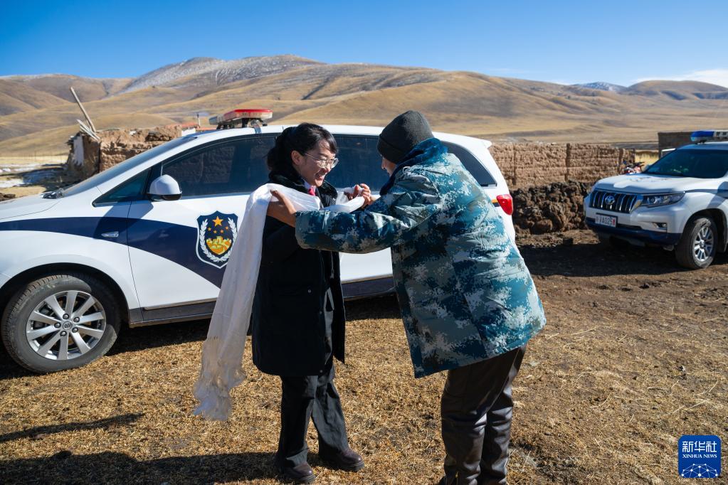 “正義雪蓮”女子審判團隊成員乘車來到距離石渠縣城70公里的呷依鄉(xiāng),準備通過巡回審判開庭審理一起離婚案。這是法官澤仁曲西(左)接受當地群眾獻上的哈達(1月10日攝)。新華社記者 沈伯韓 攝