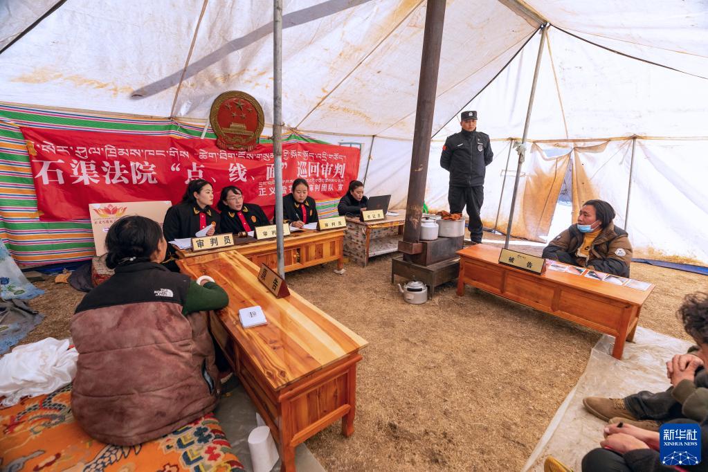 “正義雪蓮”女子審判團隊成員乘車來到距離石渠縣城70公里的呷依鄉(xiāng),在一頂帳篷布置成的“帳篷法庭”里,法官澤仁曲西帶領團隊開庭審理一起離婚案(1月10日攝)。新華社記者 沈伯韓 攝