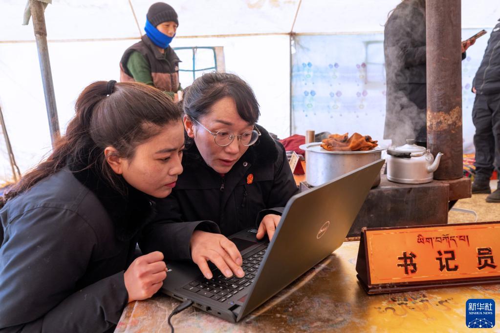 “正義雪蓮”女子審判團隊成員乘車來到距離石渠縣城70公里的呷依鄉(xiāng),準備通過巡回審判開庭審理一起離婚案。在一頂帳篷布置成的“帳篷法庭”里,法官澤仁曲西(前右)與同事為開庭做準備(1月10日攝)。新華社記者 沈伯韓 攝